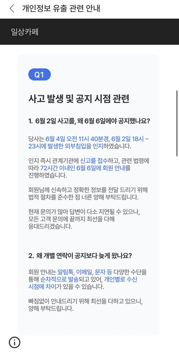2025년 6월 기준, 일상카페 운영 측은 일부 사용자 정보가 외부 유출된 정황을 확인했다고 밝혔으며, 이용자들에게 비밀번호 변경 권고 및 점검 요청을 진행하고 있습니다.