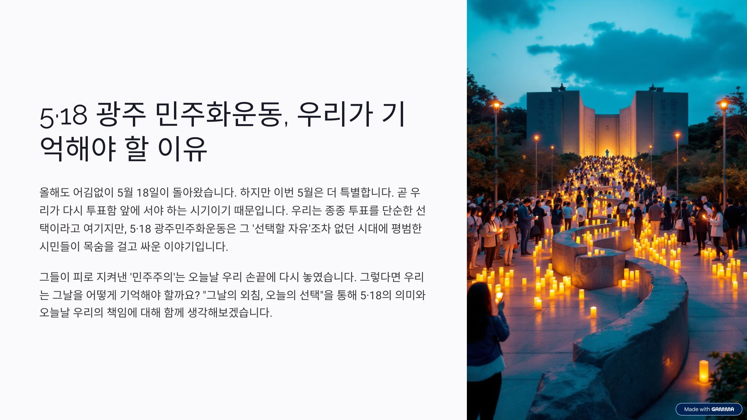 그들이 피로 지켜낸 ‘민주주의’는 오늘날 우리 손끝에 다시 놓였습니다. 그렇다면 우리는 그날을 어떻게 기억해야 할까요?