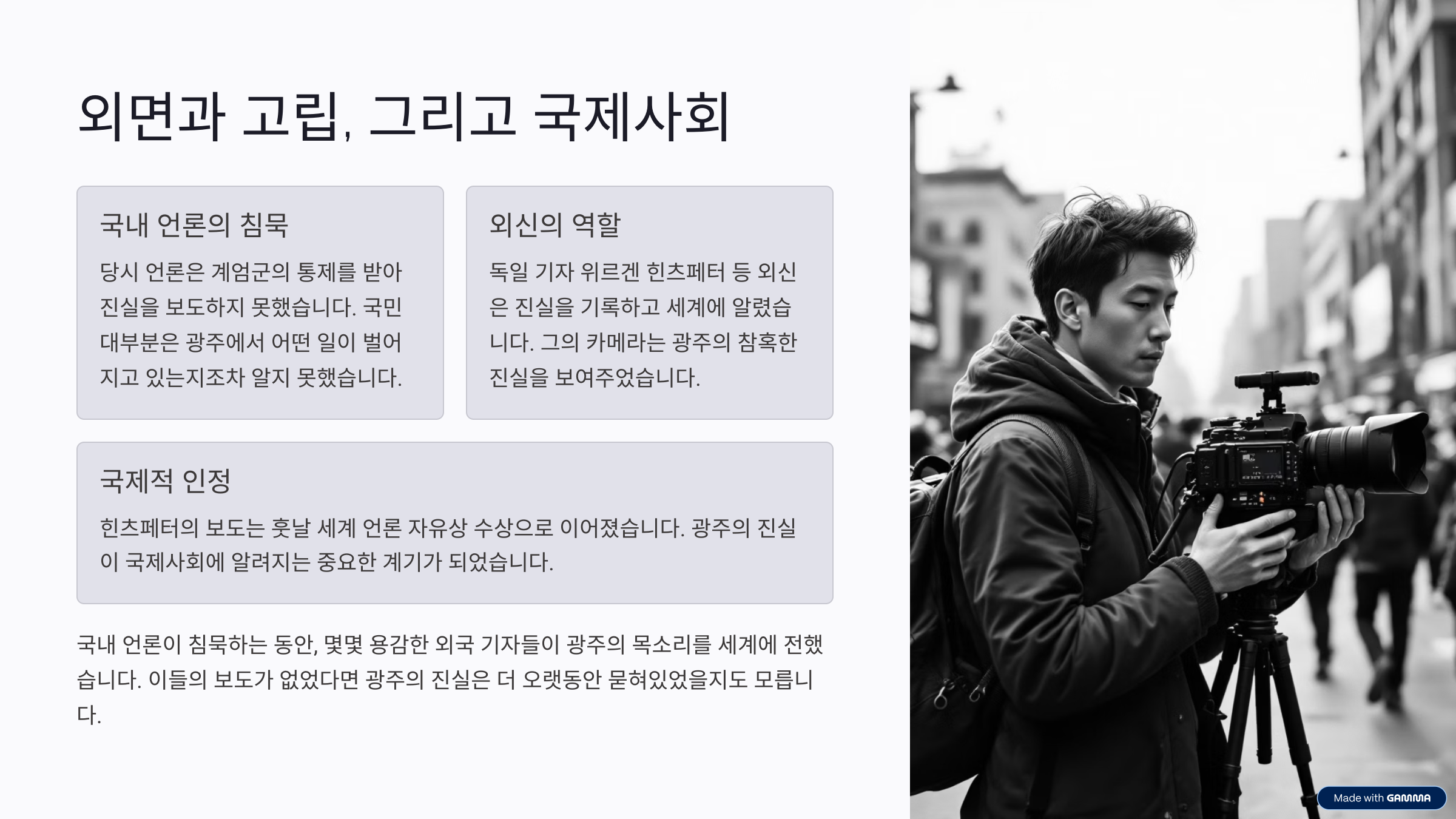 반면 외신(독일 기자 위르겐 힌츠페터 등)은 진실을 기록하고 세계에 알렸습니다.